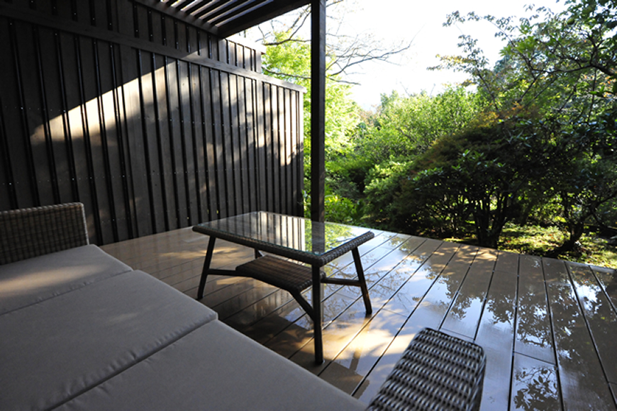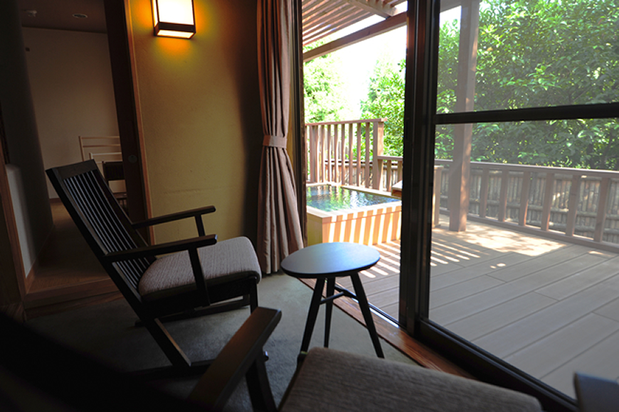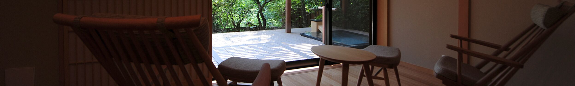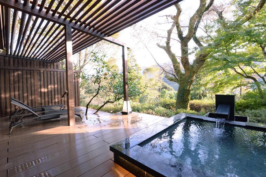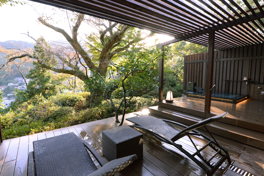 2013年夏に改装いたしました源泉掛流しの露天風呂付客室です。ゆったりとしながらも凛とした空間の正統派数寄屋造りの趣きとしつらえ、広縁には飛騨の銘家具、数々の特別アメニティをご用意しております。遠くに箱根連山の稜線を望む緑豊かな借景が拡がり、ライトアップされる木々が幻想的な広々としたデッキテラス。ゆったりとした贅沢なプライベートの時間をお過ごしいただける粋をしつらえました。