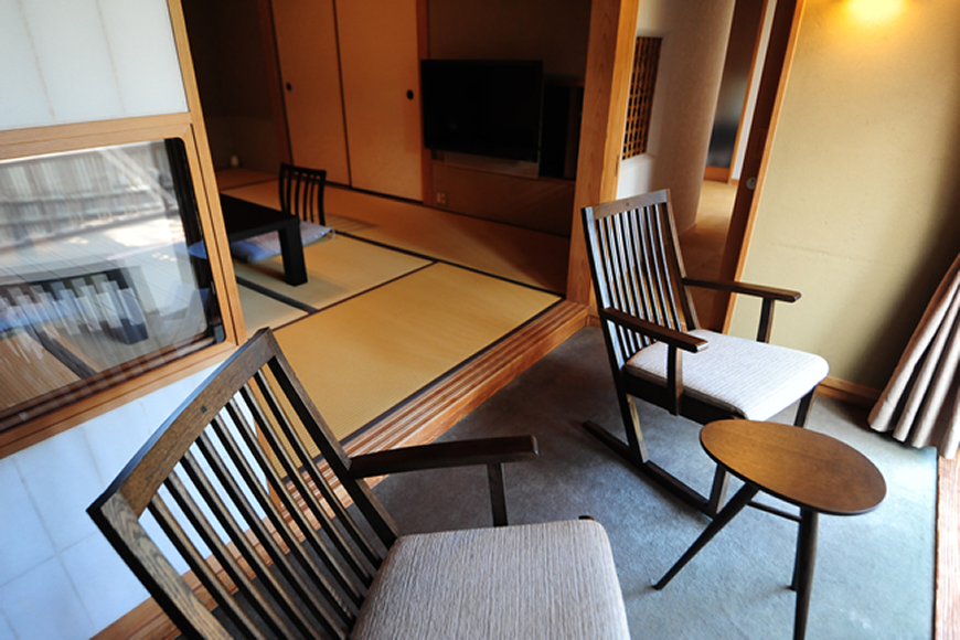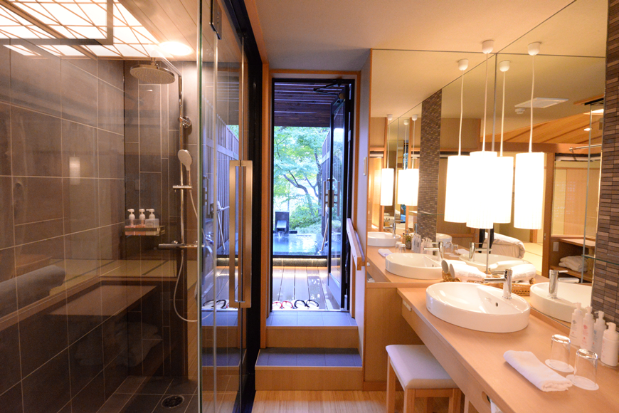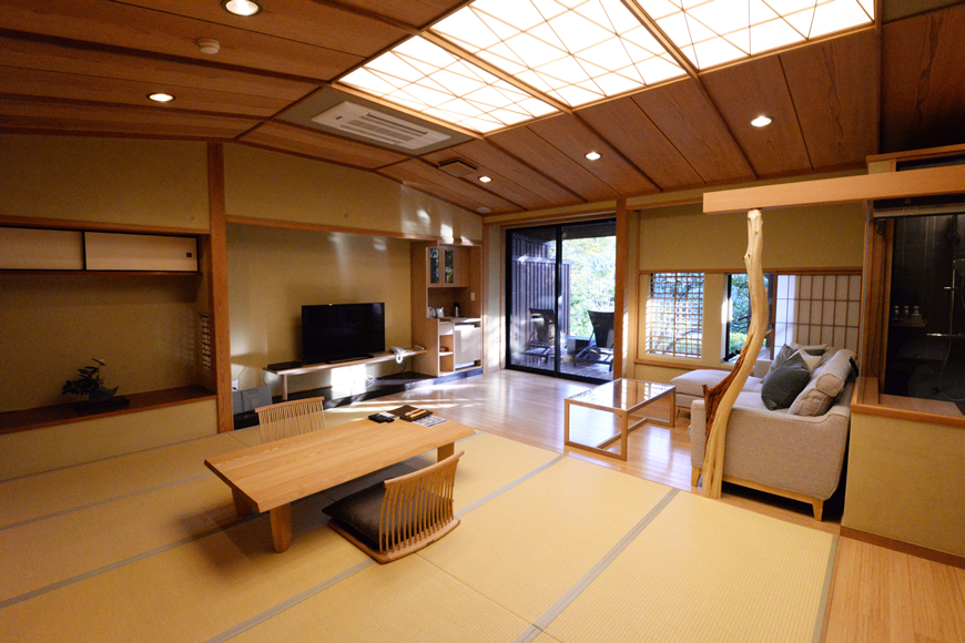 Renovated in 2017, this is a guestroom with an open-air bath, drawn directly from a hot spring source. You can experience staying at a traditional Japanese house in the sukiya-style building, equipped with a sawara cypress indoor bath, luxury shower booth, and special amenities.