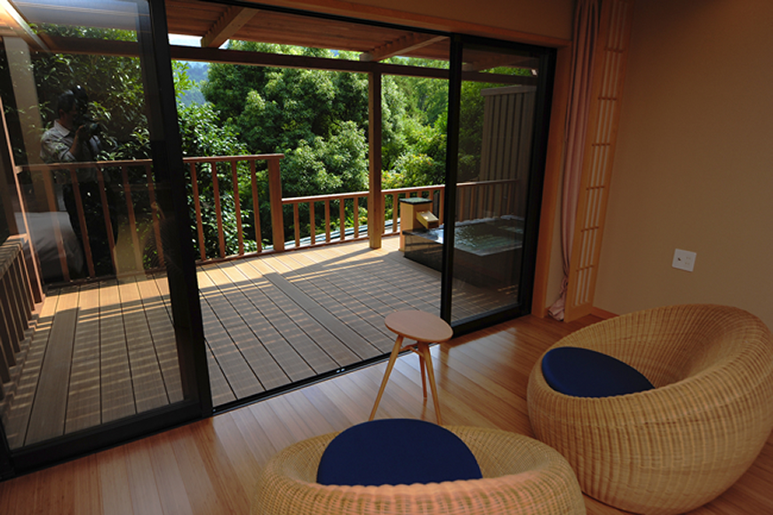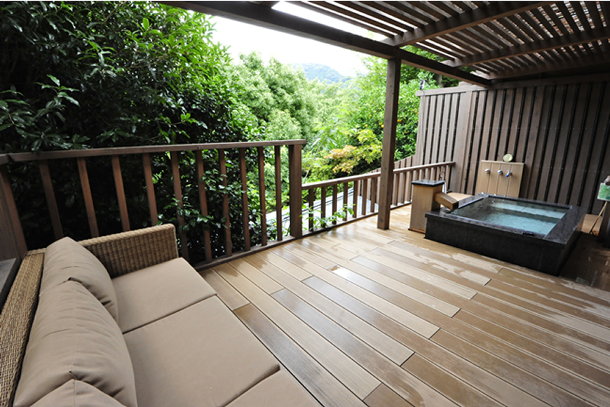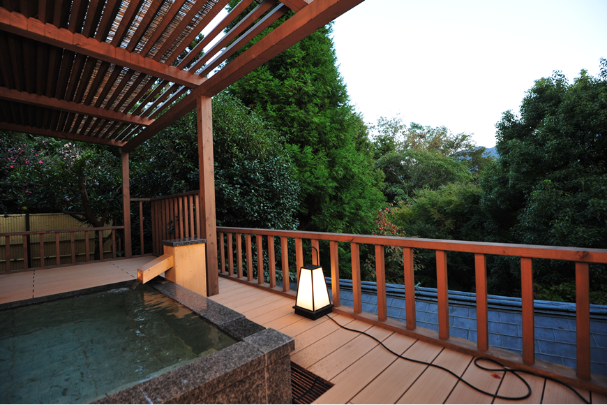 2013年夏に新設いたしました源泉掛流しの露天風呂付客室です。広々としたデッキテラスからは、眼前に夜間にはライトアップされる木々が幻想的に広がり、遠くに箱根連山の稜線を望む事が出来る借景です。ゆったりとした贅沢なプライベートの時間をお過ごしいただける粋をしつらえました。