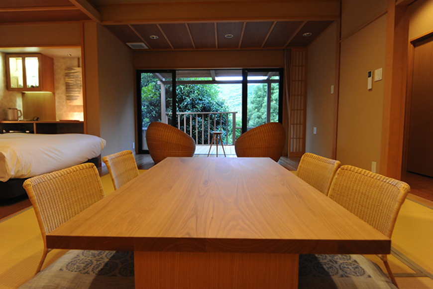 2013年夏に改装いたしました源泉掛流しの露天風呂付客室です。ゆったりしたシーリーのダブル・ツインベッドに、心地よさを追求した剣持勇デザインの銘家具、ラグジュアリーシャワーブース、数々の特別アメニティをご用意しております。緑の空中に突き出る形で広がるデッキテラスからは、眼前に夜間にはライトアップされる木々が幻想的に広がり、遠くに箱根連山の稜線を望む事が出来る借景です。ゆったりとした贅沢なプライベートの時間をお過ごしいただける粋をしつらえました。