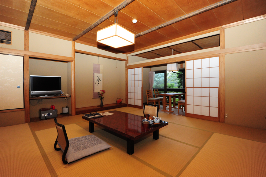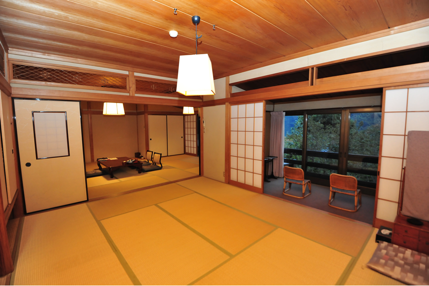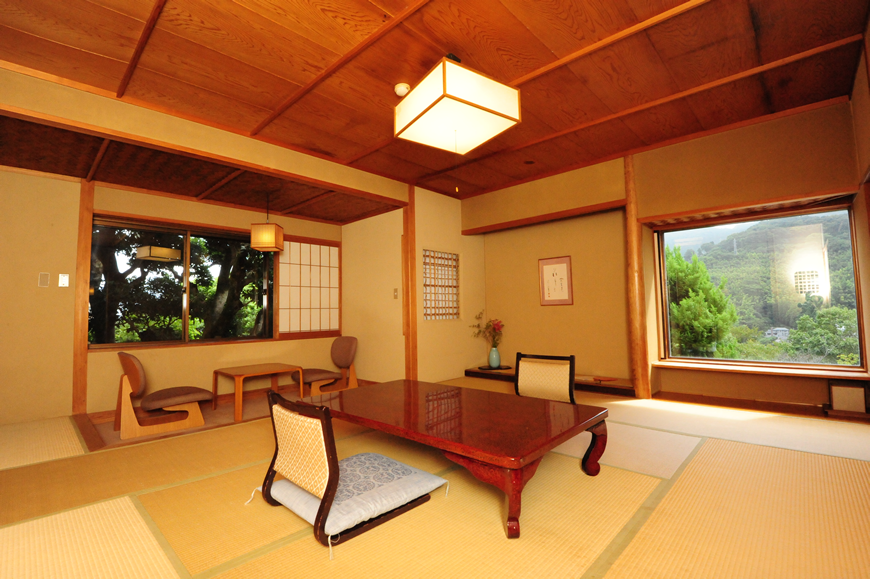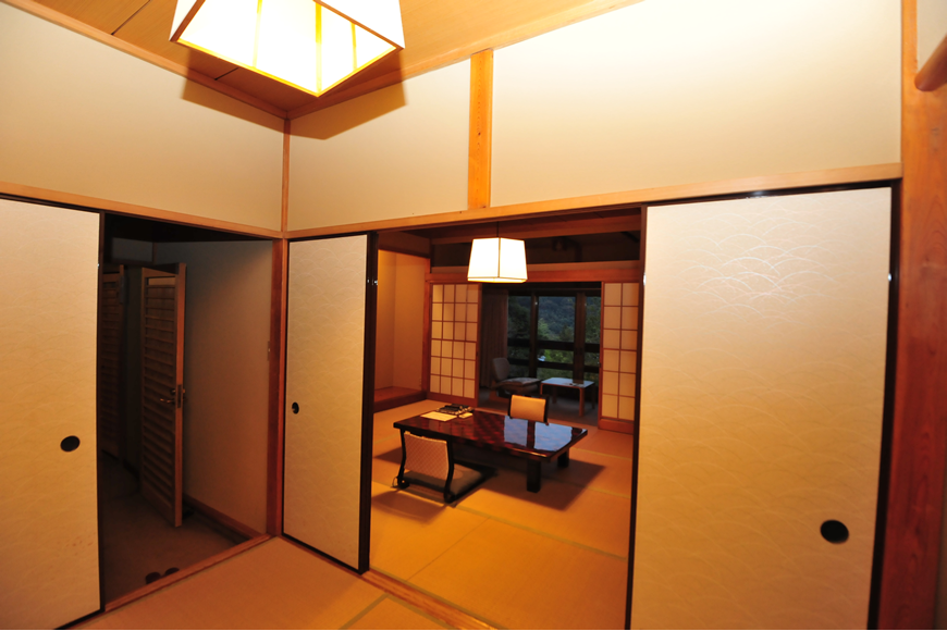 14畳の本間と10畳の次の間の二間、複数世帯のご家族やご友人等と、大勢様でご一緒に泊まれる、数寄屋造りのゆったりした客室です。団欒を楽しめる広縁も二カ所あり、大きな窓からの眺望は、夜には幻想的にライトアップされる主庭園を見下ろし、遠くに箱根連山の稜線を見晴らすことができます。
