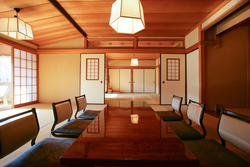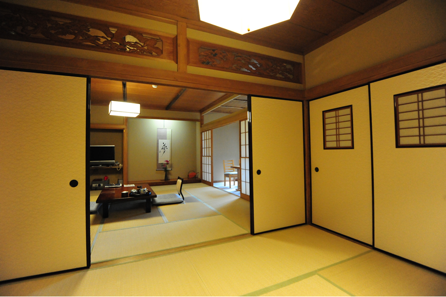 12.5畳の本間と6畳の次の間の二間、複数世帯のご家族や、ご友人と大勢様でご一緒に泊まれる、ゆったりとした数寄屋造りの客室です。広縁には、ダイニングテーブルとチェア四脚を備え、団欒をお楽しみいただけます。大きな窓からの眺望は、夜には幻想的にライトアップされる主庭園を見下ろし、遠くに箱根連山の稜線を見晴らすことができます。