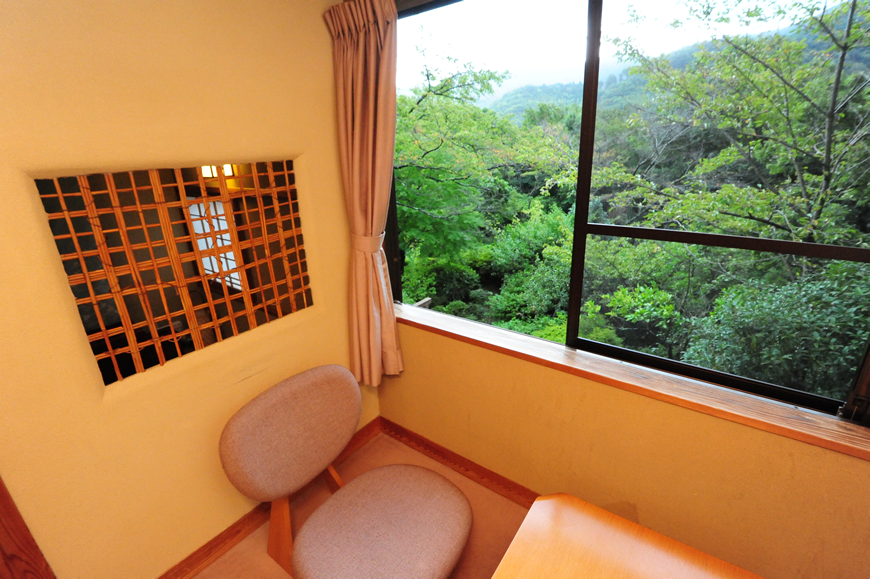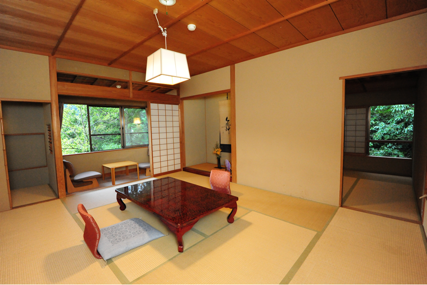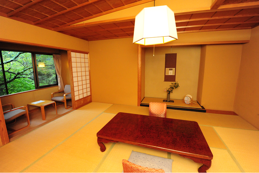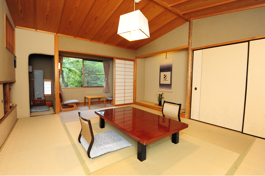 数寄屋の意匠美に満ちたしつらえと趣き。凛とした空間の質を持つ、10畳の本間の阿しか里の代名詞的客室です。茶室意匠の天井、床の間、正統な数寄屋空間と、遊び心のある山小屋風のお風呂が特徴です。広縁には、ゆったりとしたチェアとテーブル。窓からは、まさに緑に囲まれた野山の自然の景観、正面に岩戸山と、遠く箱根連山の稜線を見晴らすことができる眺望をお楽しみいただけます。