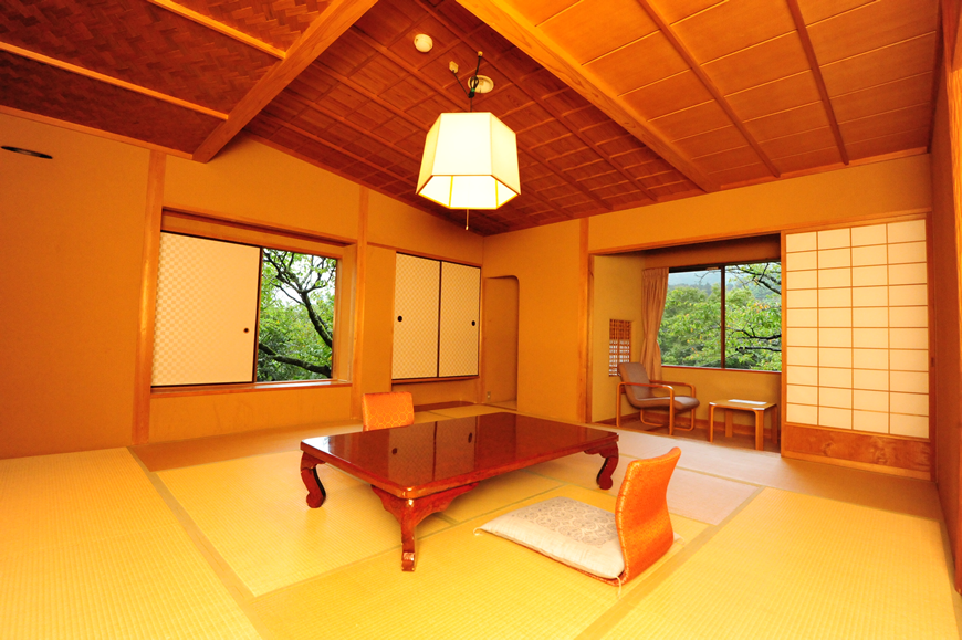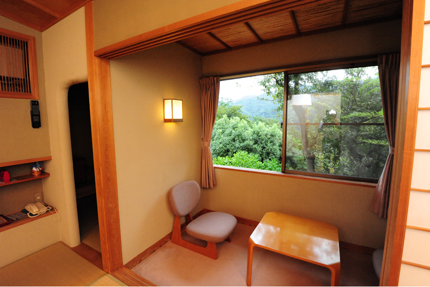 数寄屋の意匠美に満ちたしつらえと趣き。凛とした空間の質を持つ、10畳の本間の阿しか里の代名詞的客室です。眺望豊かな広縁には、ゆったりとしたチェアとテーブル。茶室意匠の天井、床の間、檜の内風呂、小さな化粧室もあり、正統な数寄屋空間をゆっくりとご堪能いただけます。窓からは、目前眼下には、緑あふれる野山の庭園を見下ろし、正面に岩戸山と、遠く箱根連山の稜線を見晴らすことができます。